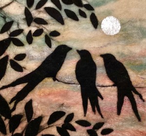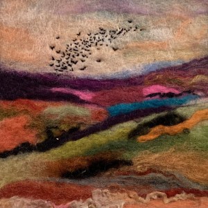 Today Caren’s uses wool & silk fibres in a ‘painterly’ way in order to create textural moody felt pieces that depict, landscapes, seascapes & floral designs. As well as felt, Caren works in other textile media including: Batiks, Silk Paintings, Hand Made Silk Paper pieces & Devore.